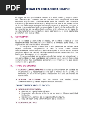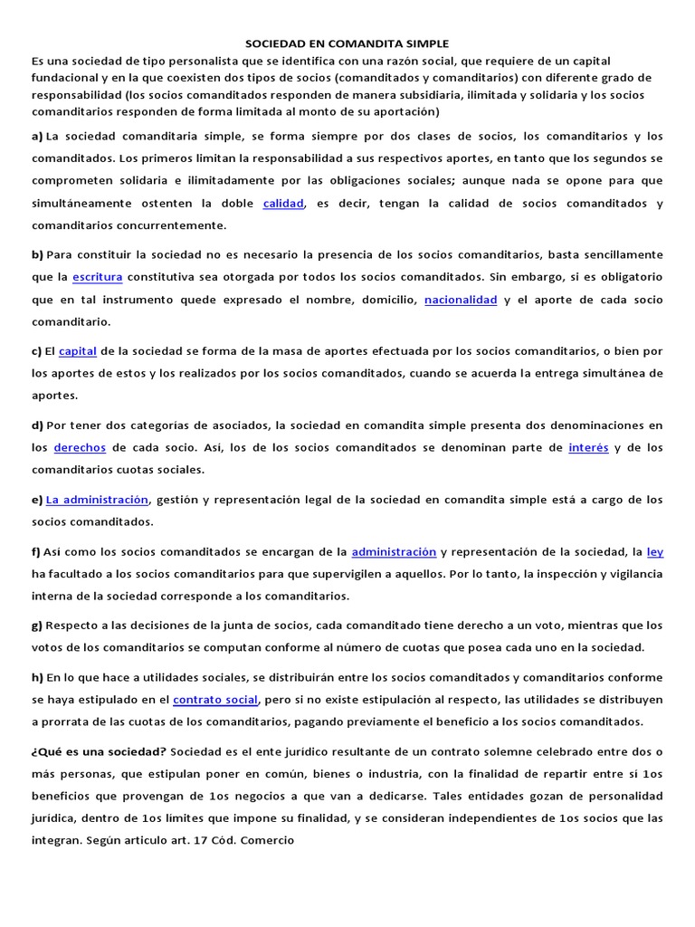 Hay dos tipos de sociedad en comandita , simple y por acciones, pero solo la simple hace parte del grupo de las sociedades de personas (fierro, p.12) : Sus aportes se representan por acciones. Los socios comanditarios limitan su responsabilidad al capital que se obligan a aportar; Obligan todo su patrimonio solidariamente. May 02, 2019 · pergunta 4 nesse tipo societário há duas espécies de sócios: Uno o más socios comanditarios. Mínimo 2 socios, de los cuales uno al menos será socio colectivo. Los socios colectivos pueden atraer el capital de otros sin que estos interfieran en la gestión de la empresa. Legislação consolidada sem valor legal: Pode consultar estes e outros códigos por actividade. Código civil, código penal, código do trabalho, código do procedimento administrativo, etc. Uno o más socios gestores. Jul 11, 2001 · en este tipo de sociedad se distinguen dos clases de socios, los comanditarios cuya responsabilidad está limitada a sus aportes, y los colectivos que responden como en la sociedad colectiva.